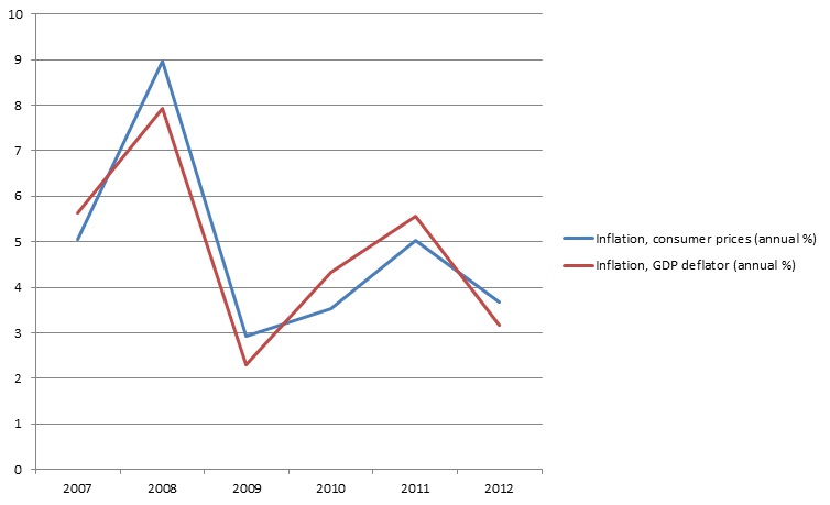 - World Bank – Inflation GDP deflator annual retrieved 1-5-2014