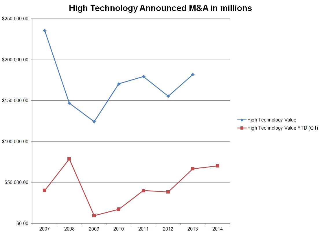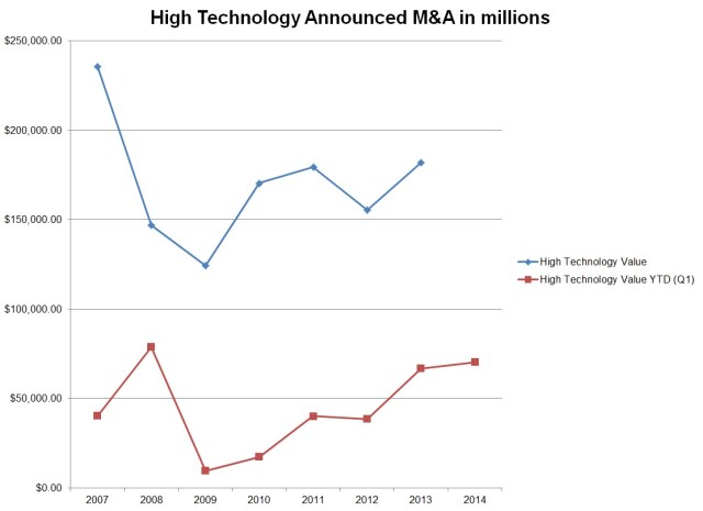 Global annual and first quarter announced values in technology M&A. Note – All Q1 values are estimates based on multiplying global M&A Q1values by global sector share of High Technology, except for years 2007, 2013 and 2014 which are actual values (6)(7)(8). Annual figure is estimated (6). Source: Thomson Reuters
